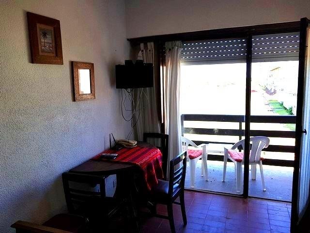 *Living comedor con sillón cama y carrito. Mesa semicircular desplegable con banquetas. Tv.