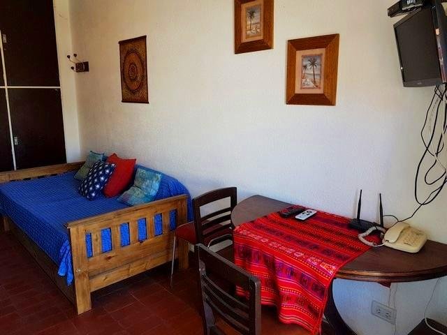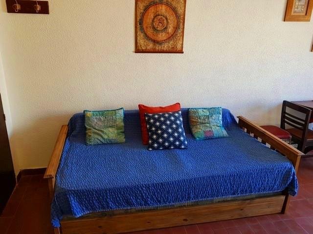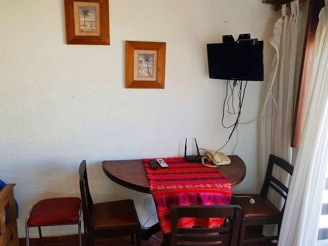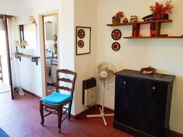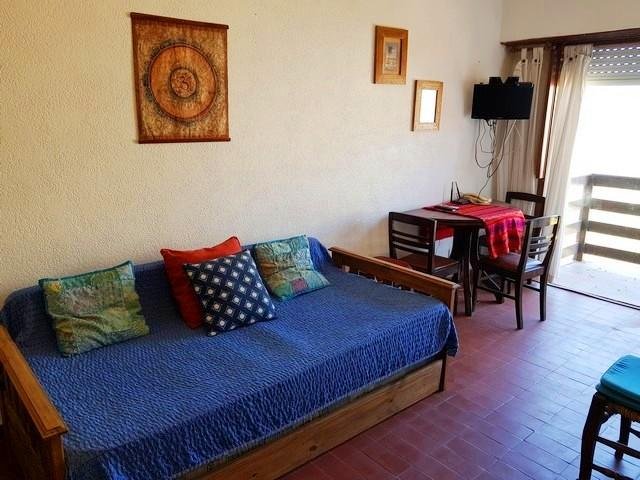 *Living comedor con sillón cama y carrito. Mesa semicircular desplegable con banquetas. Tv.